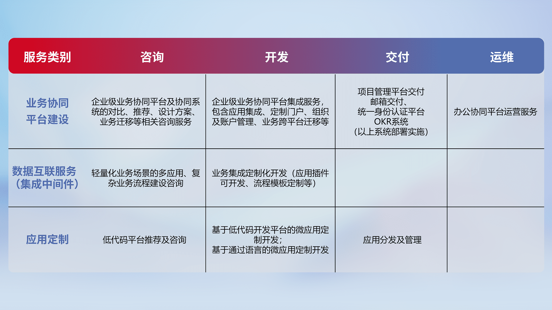 针对钉钉、、企微、、、IDaas等平台级产品提供产品的规划、、、、方案、、、交付、、定制化开发等服务,,,实现如统一协同办公、、、、智能客户服务、、、混合会议管理、、、、智能数据查询、、、、等业务场景,,,,实现数字化转型。。。
