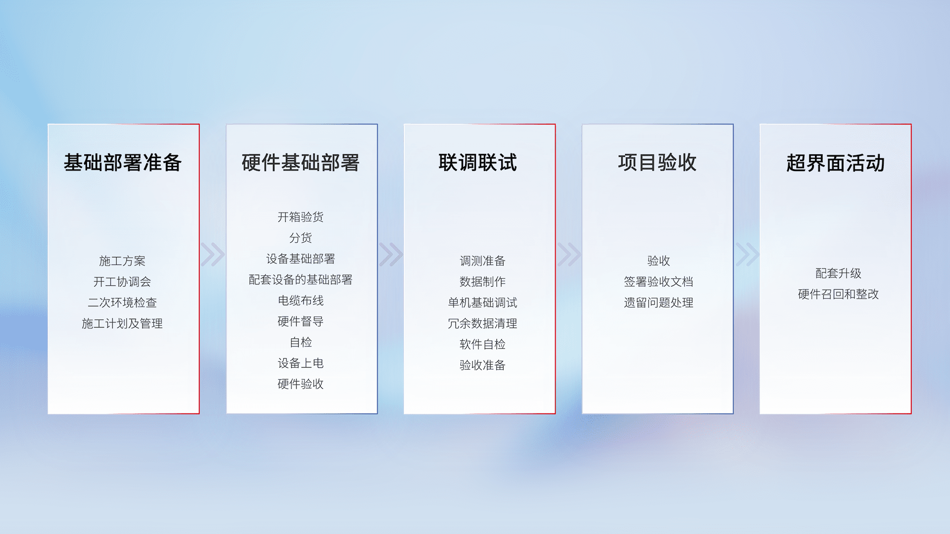 从基础部署准备、、硬件基础部署、、、联调联试、、项目验收、、越界面活动的全过程可追溯,,,保证施工质量和进度。。。。